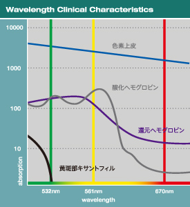 561 nmの黄色波長:ヘモグロビンによる吸収が最も多く、黄斑のキサントフィルによる吸収は無視できる程度