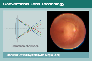 低屈折ガラスのクラウンガラスと、高屈折率ガラスのフリントガラスの2枚の光学素子をもつ非球面アクロマティックダブレットレンズはシングレットレンズと比較して色収差や球面収差を高次に補正します。
