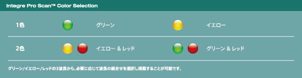 Integre Pro Scan™は、お客様の臨床的な要望を最大限に実現するために、2種類の波長まで設定することができます。以下に示す、561 nmの黄色、670 nmの赤色、又は532 nmの緑色の組み合わせを選択してください。