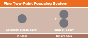 ファインフォーカシングシステムは、高精度の2点式照準システムで、±8μmの精度で組織からの焦点のズレを容易に把握できるため、正確な照準が可能で、眼内レンズへ損傷を最小化します。